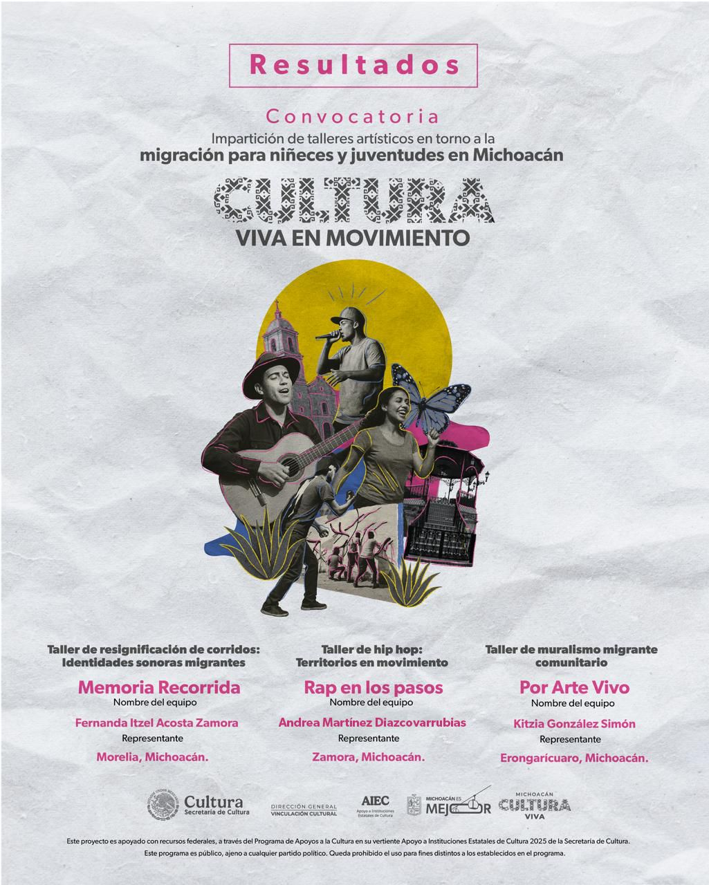 La Secretaría de Cultura de Michoacán (Secum) dio a conocer los resultados de la convocatoria Cultura en Movimiento, sobre la impartición de talleres artísticos en torno a la migración para niñeces y juventudes de Michoacán, la cual cerró el pasado 10 de octubre con una destacada participación de artistas y colectivos de distintas regiones del estado.