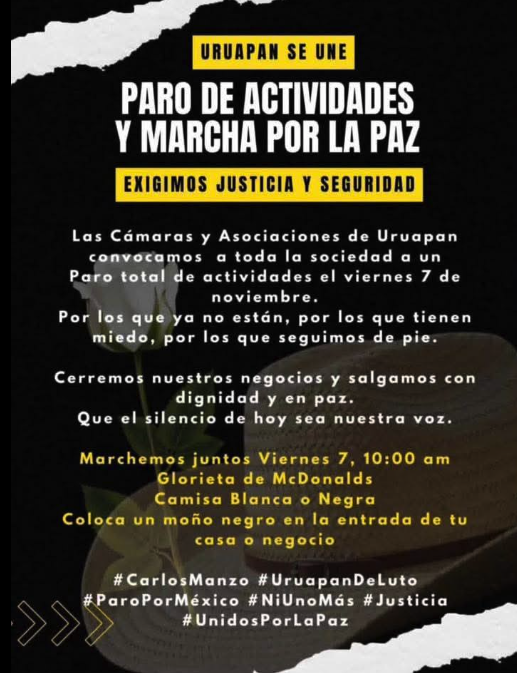En Morelia, al tiempo que se realizaban las primeras reuniones de trabajo para integrar el Plan Michoacán por la Paz y la Justicia, un grupo de ciudadanos marchó en silencio por el Centro Histórico en demanda de justicia por el asesinato del alcalde de Uruapan, Carlos Manzo Rodríguez.