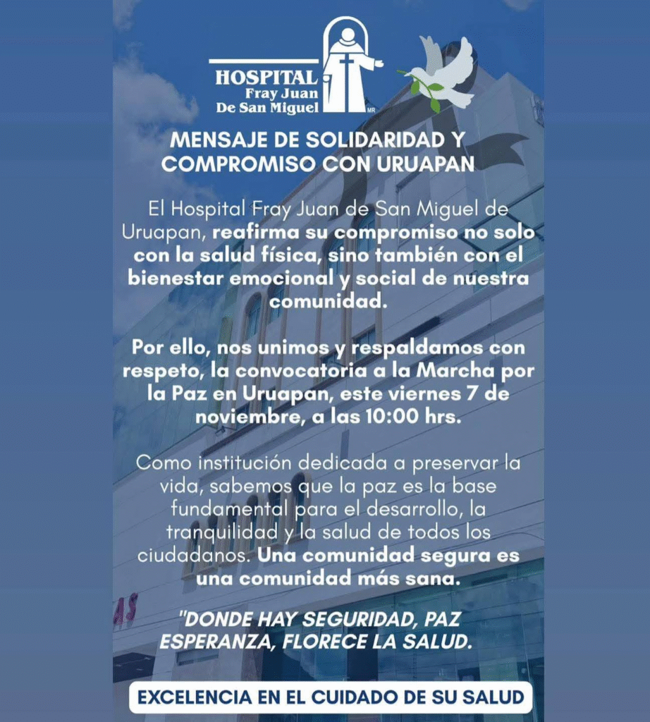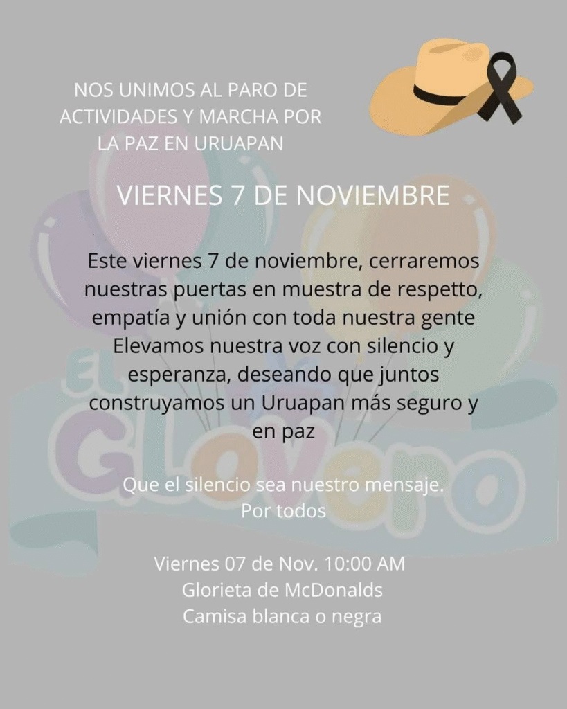 El acto, convocado por simpatizantes del llamado Movimiento del Sombrero, coincidió con el arranque formal de la consulta estatal encabezada por la secretaria de Gobernación, Rosa Icela Rodríguez, el gobernador Alfredo Ramírez Bedolla y 59 presidentas y presidentes municipales. La estrategia, impulsada por el Gobierno Federal tras los hechos ocurridos en Uruapan, busca atender la situación de violencia en la entidad a través de tres ejes: seguridad y justicia; desarrollo económico con justicia; y educación y cultura para la paz.