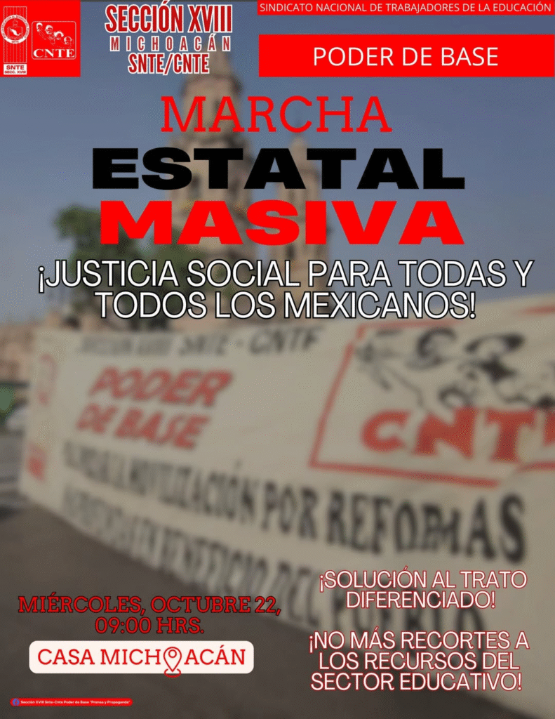 Castillo Ferrel señaló que la marcha tiene como objetivo exigir a los gobiernos estatal y federal el cumplimiento de los acuerdos firmados el pasado 16 de julio, cuando se levantó el plantón magisterial. “Nosotros convocamos a una marcha masiva estatal este 22 de octubre que partirá de Casa Michoacán hacia Palacio de Gobierno; exigimos el pago de todos los compañeros que cobran vía cheque, pues hoy la Secretaría de Educación no está cumpliendo con esta obligación”, afirmó. El dirigente llamó al gobernador Alfredo Ramírez Bedolla, al secretario de Gobierno, Raúl Zepeda Villaseñor, y a la secretaria de Educación, Gabriela Molina Aguilar, a dar respuesta directa a las exigencias del magisterio.