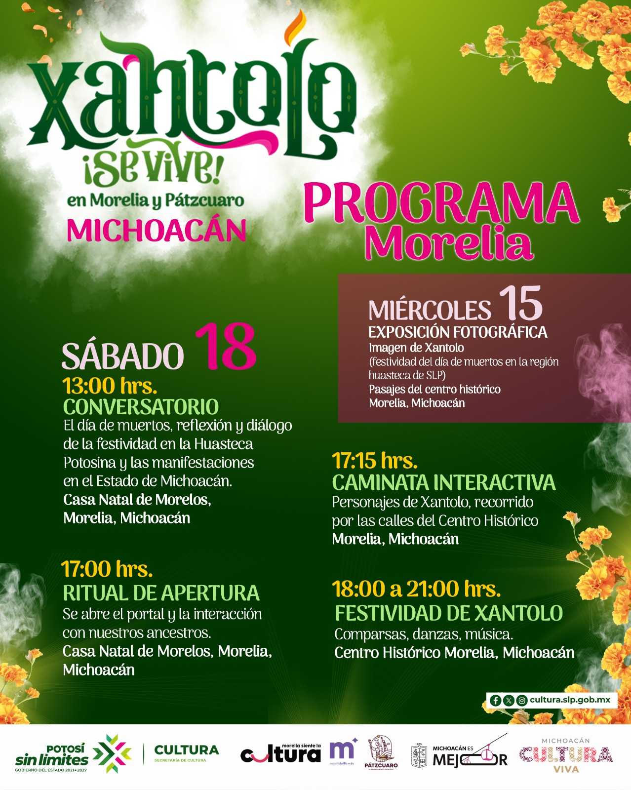 En Morelia, las actividades iniciarán el miércoles 15 con la exposición fotográfica “Imagen de Xantolo”, en el Centro Histórico. El sábado 18 a las 13:00 horas se realizará un conversatorio en la Casa Natal de Morelos sobre la festividad del Día de Muertos en la Huasteca Potosina y sus manifestaciones en Michoacán