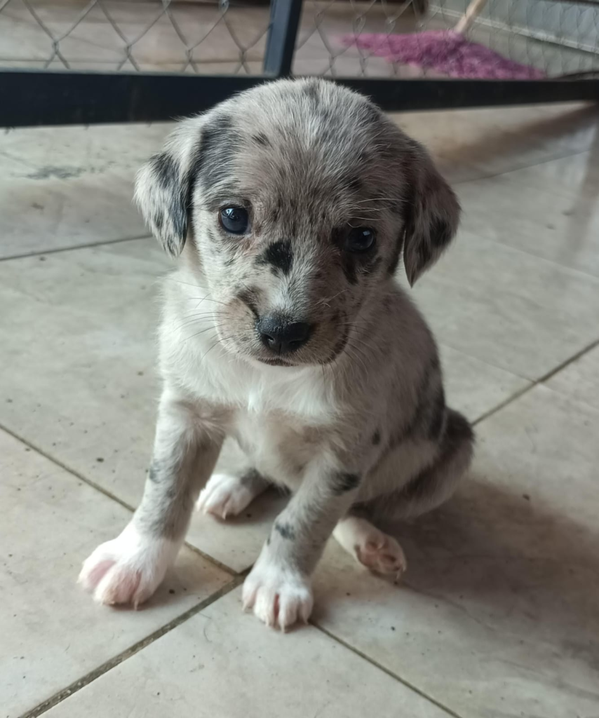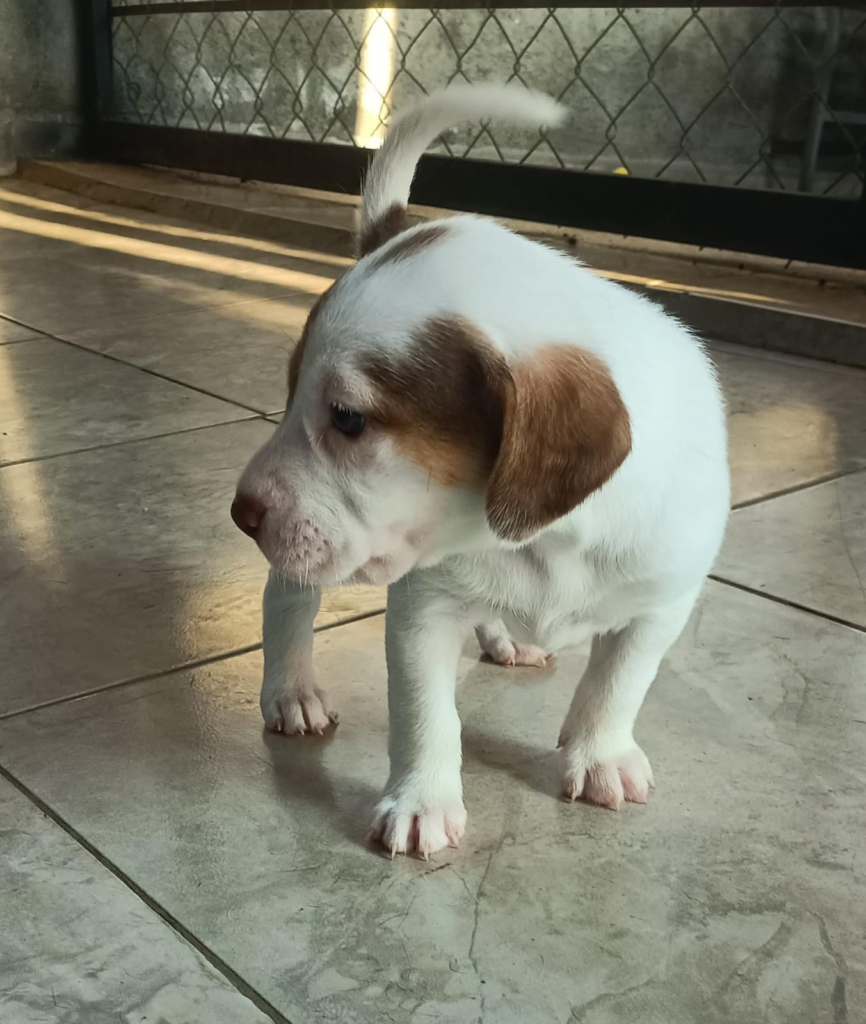 Su cuerpo blanco y su cabeza negra la hacen destacar de inmediato, sin embargo, su corta edad la llena de energía, de ganas de jugar y de vivir, cualidades que no todos están dispuestos a comprender.
