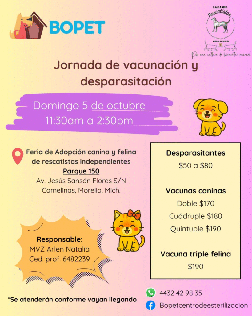 Además, para los humanos responsables, el colectivo ofrecerá servicios médicos veterinarios a bajo costo, desparasitantes de 50 a 80 pesitos según talla, vacunas caninas doble en 170, cuádruple en 180 y quíntuple en 190, mientras que la triple felina estará en 190 pesos.