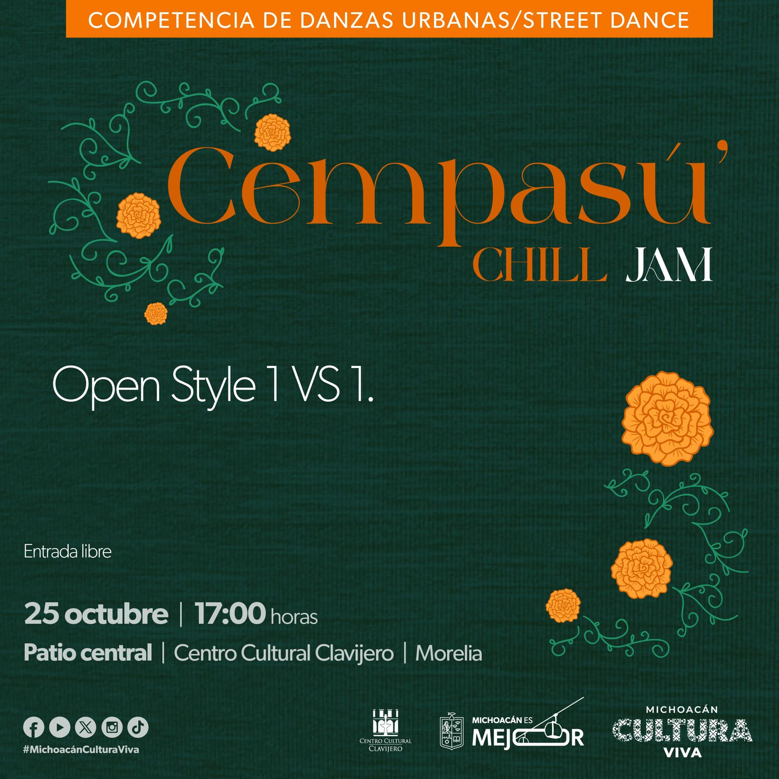 La Secretaría de Cultura de Michoacán (Secum) invita a todas y todos los amantes del baile a participar en el Cempasú´Chill Jam 2025, un encuentro que celebra la danza urbana, la creatividad y el talento joven. La cita es este sábado 25 de octubre a las 17:00 horas en el segundo patio del Centro Cultural Clavijero con entrada libre.